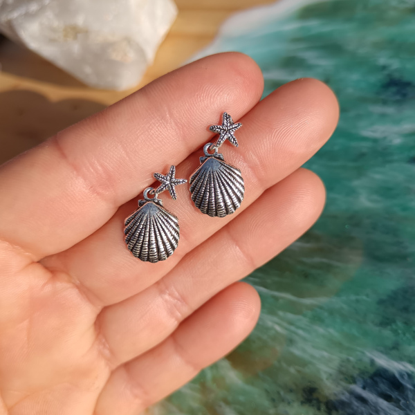 Aros de plata envejecida con broche. 2 cms de largo.Cardium y estrella de mar.